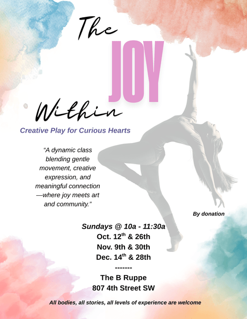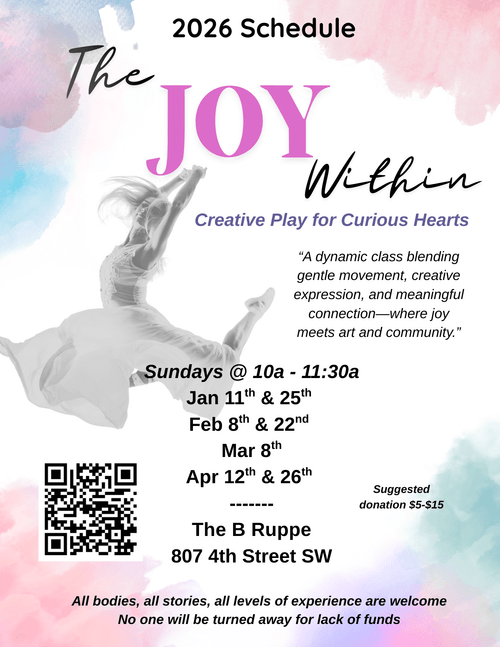 Come home to yourself through joyful expression. The Joy Within is an expressive arts class where movement, writing, and drawing weave together in playful exploration. No experience is needed—just a curious heart and a receptive body, exactly as you are.