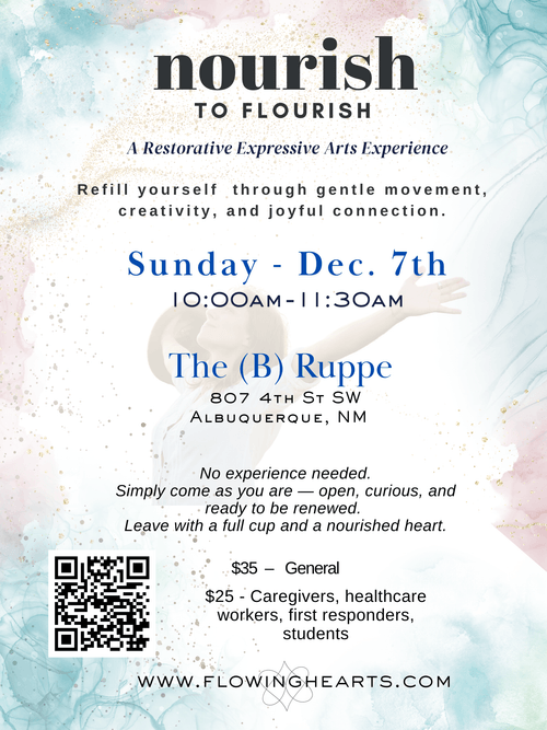 Nourish to Flourish is a playful, all-levels expressive arts class designed to help you reconnect with your inner spark. Through gentle drawing, writing, movement, and partnering/connection, you’ll explore new ways to express yourself, release stress, and rediscover your energy and delight.
